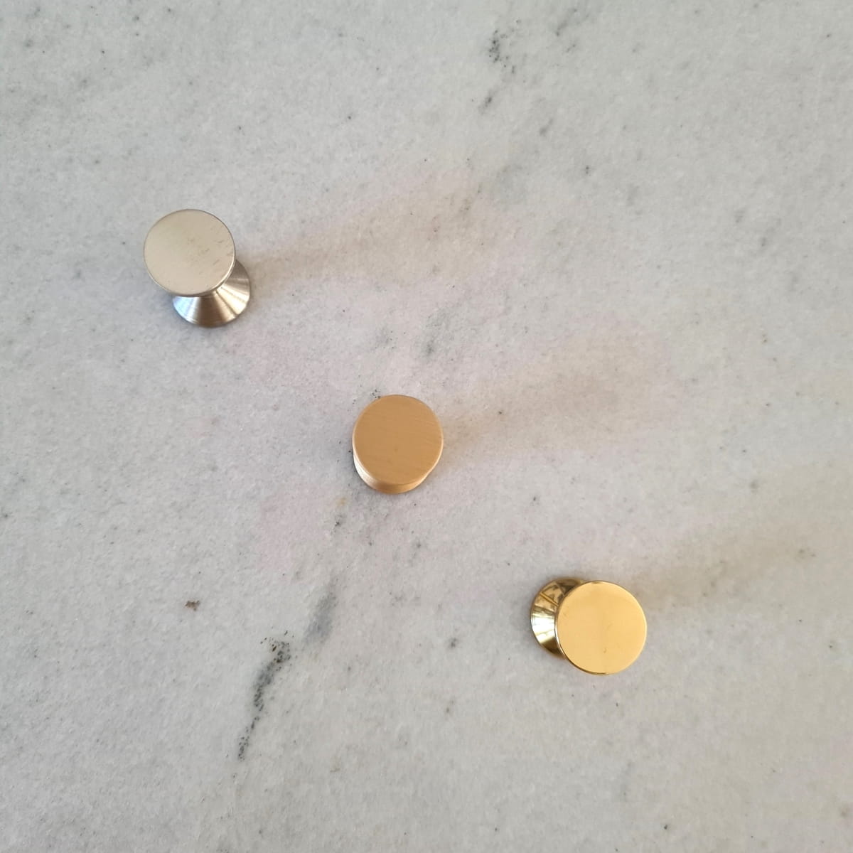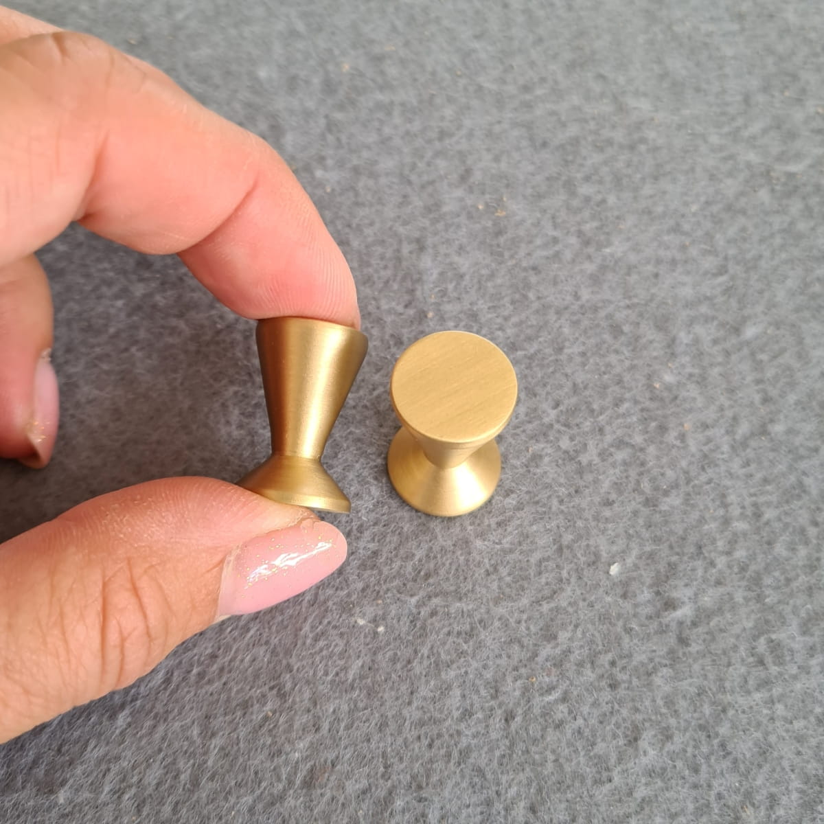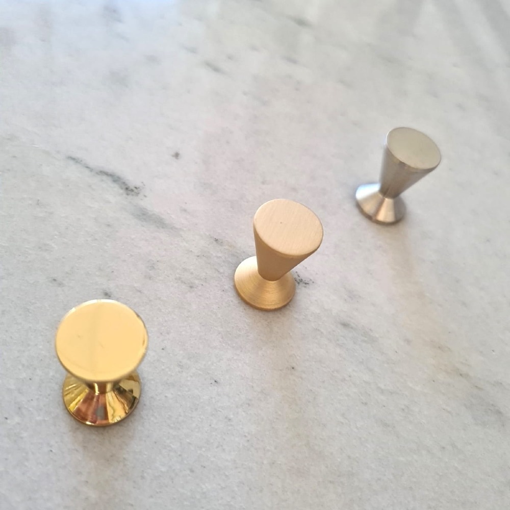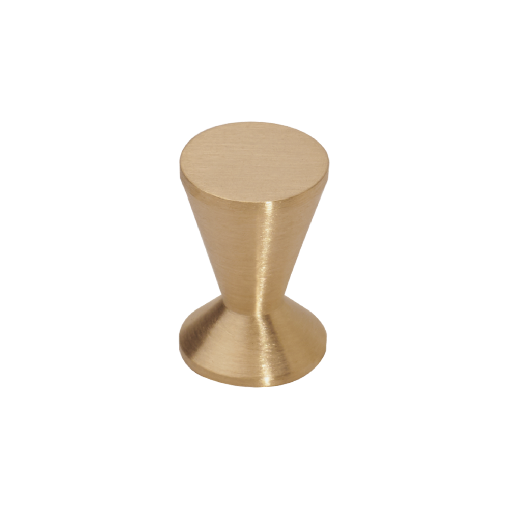 Najmniejsza gałka mosiężna z kolekcji, Jej średnica to tylko 14 mm, a lekkości dodatkowo nadaje jej ciekawa forma połączonych stożków.