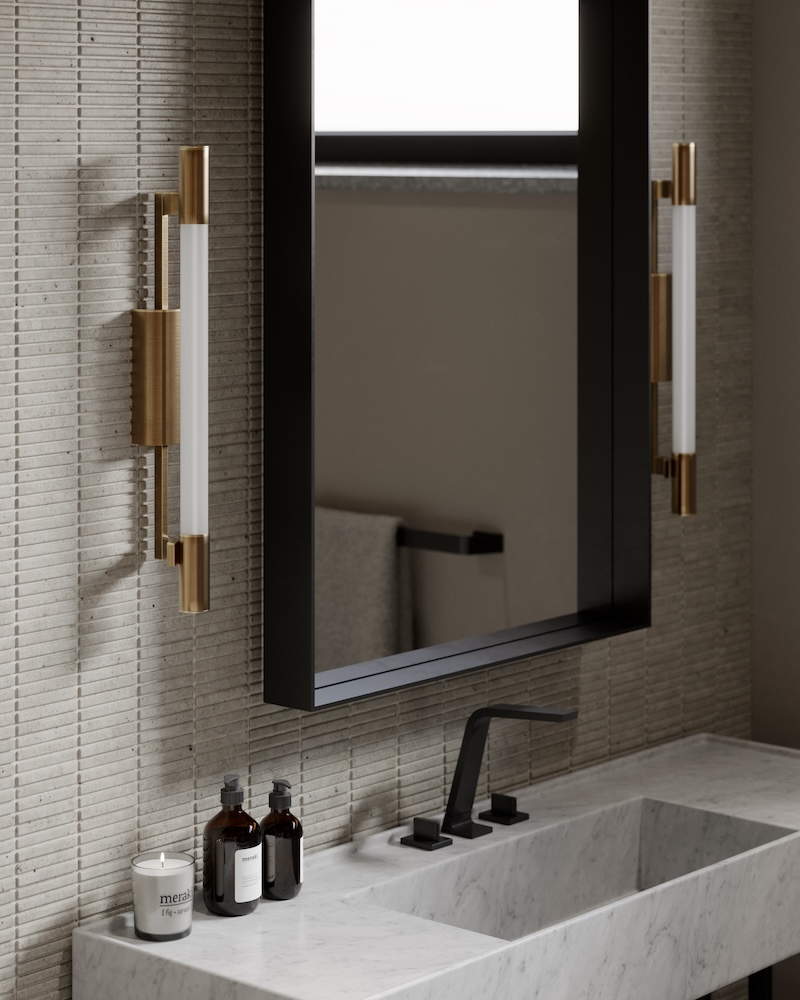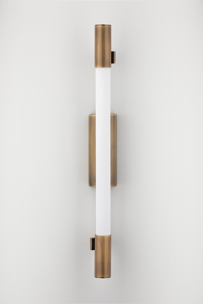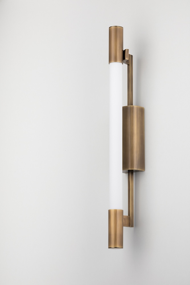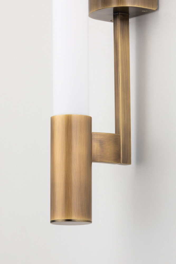 Kinkiet Marced posiada cylindryczny klosz z matowego, białego akrylu jest zakończony elementami w kolorze patynowanego mosiądzu.