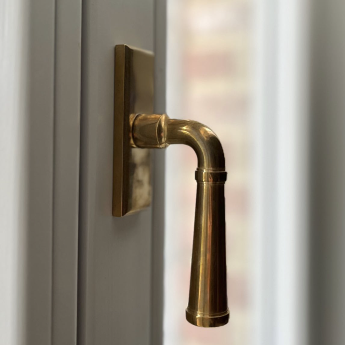 Klamka do okien wykonana z mosiądzu, może być wykonana w wielu wybarwieniach: chrom, nikiel, nikiel satyna, mosiądz satyna oraz mosiądz połysk.