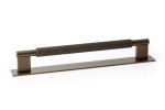 Aluminiowy uchwyt meblowy w kolorze brązu, który na rączce ma wykonane ozdobne poprzeczne frezowania.