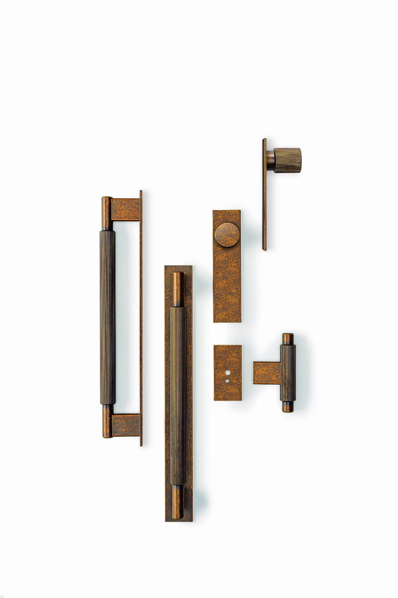 Aluminiowy uchwyt meblowy w kolorze rustykalnego złota, który na rączce ma wykonane ozdobne poprzeczne frezowania.