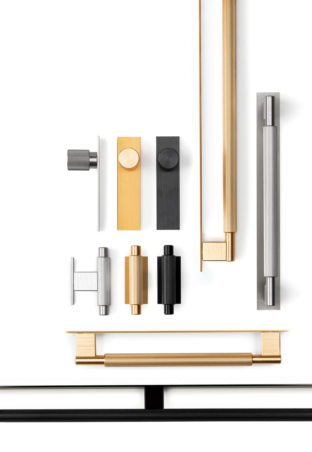 Aluminiowy uchwyt meblowy w kolorze czarnym z podkładką, który na rączce ma wykonane ozdobne poprzeczne frezowania.