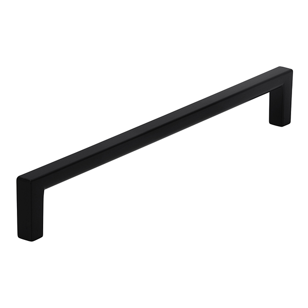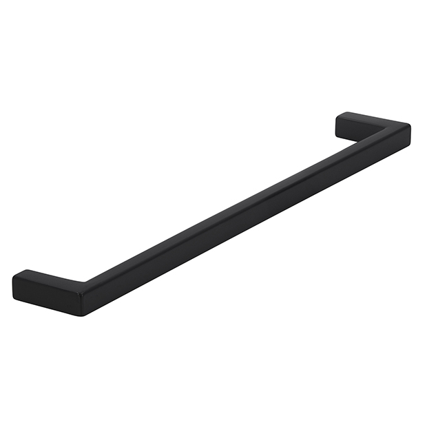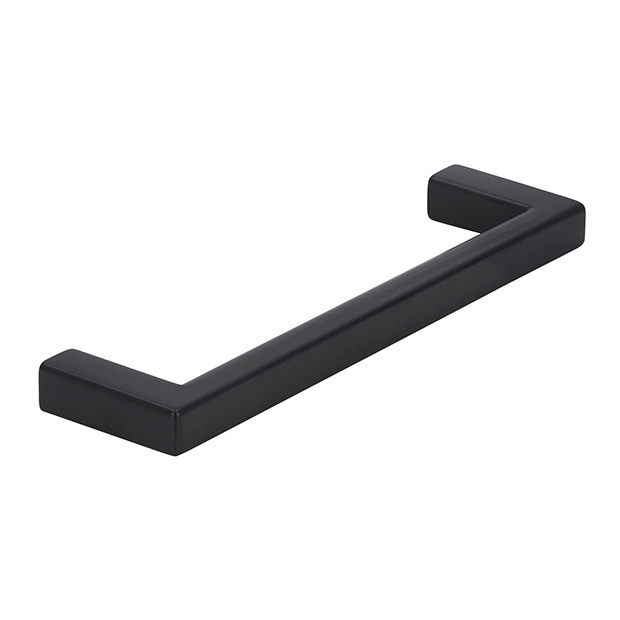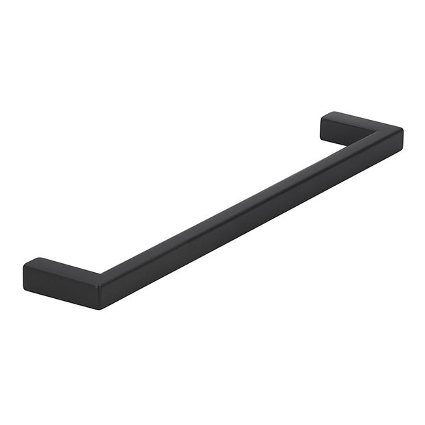 Prosty uchwyt meblowy w kolorze czarnym matowym, z bardzo ergonomiczną rączką, przyokrągloną od strony wewnętrznej.