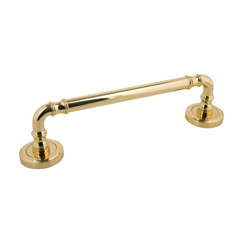 Duży masywny uchwyt meblowy z mosiądzu, z ozdobnymi toczeniami. Ta wersja ma rączkę również mosiężną. Pięknie prezentuje się na dużych drzwiach od szaf, witryn lub drzwiach przesuwnych.
