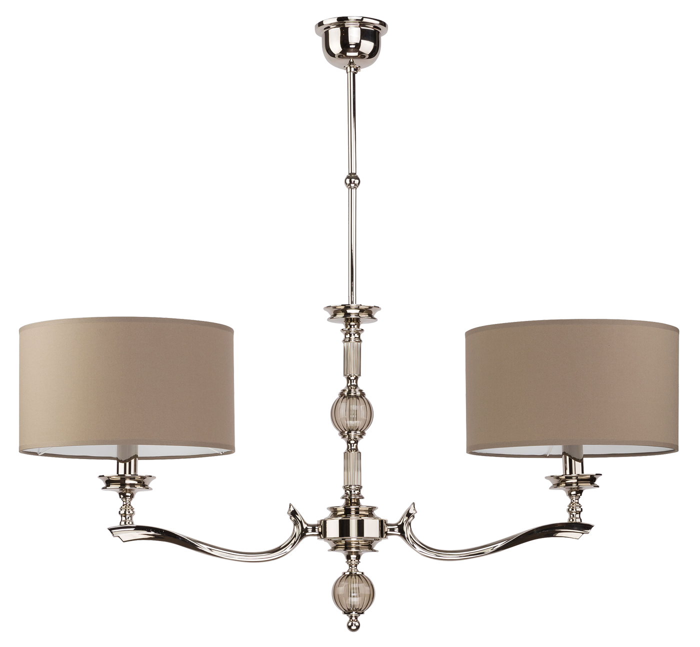Żyrandol Tivoli z 2 ramionami to klasyczny projekt oświetlenia który idealnie sprawdzi się w salonie. Mosiężna rama zwieńczona jest abażurami wykonanymi z materiału oraz ozdobiona jest szklanymi kulami i pięknymi zdobieniami. Oprawę wykonano w 5 różnych kolorach wykończenia: mosiądzu polerowanym, patynowanym, satynowym i niklowanym oraz tytanie. Dodatkowo istnieje możliwość personalizacji koloru abażurów lampy spośród 7 różnych kolorów. Możliwa jest regulacja wysokości zawieszenia wedle potrzeb klienta.