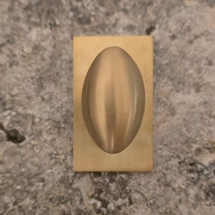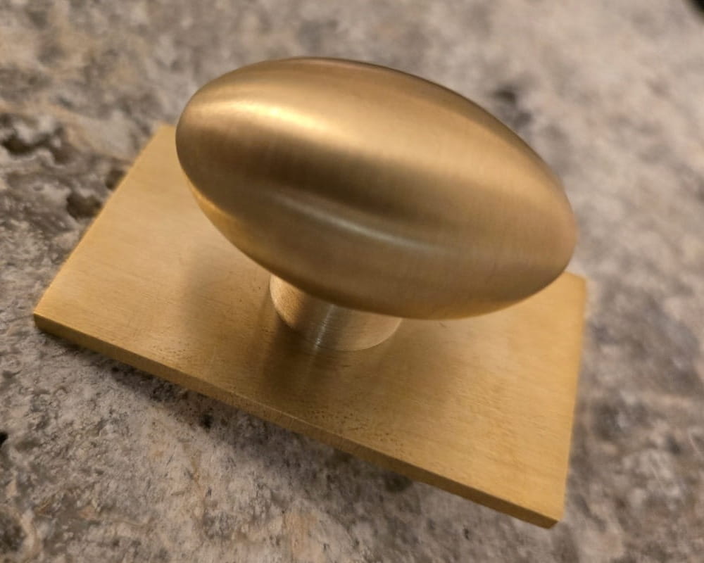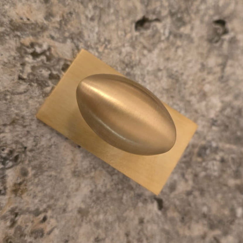 Gałka meblowa GM155 to elegancka mosiężna gałka w kształcie owalnym, zamontowana na kwadratowej podstawie. Wykonana z wysokiej jakości mosiądzu o szczotkowanym wykończeniu, co nadaje jej subtelnego, matowego połysku.