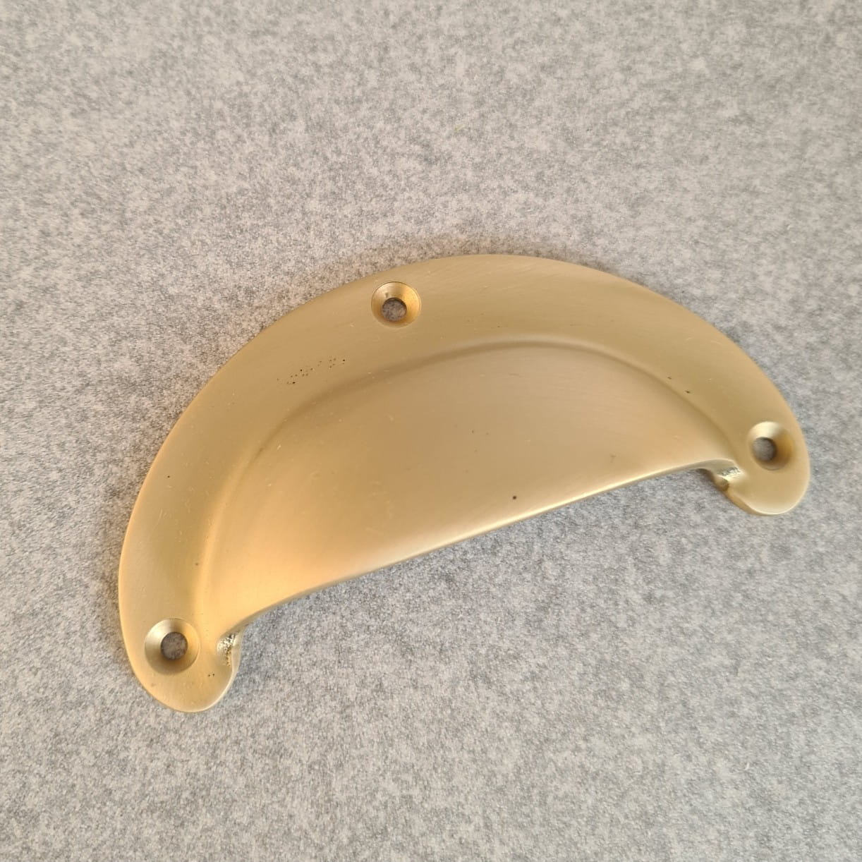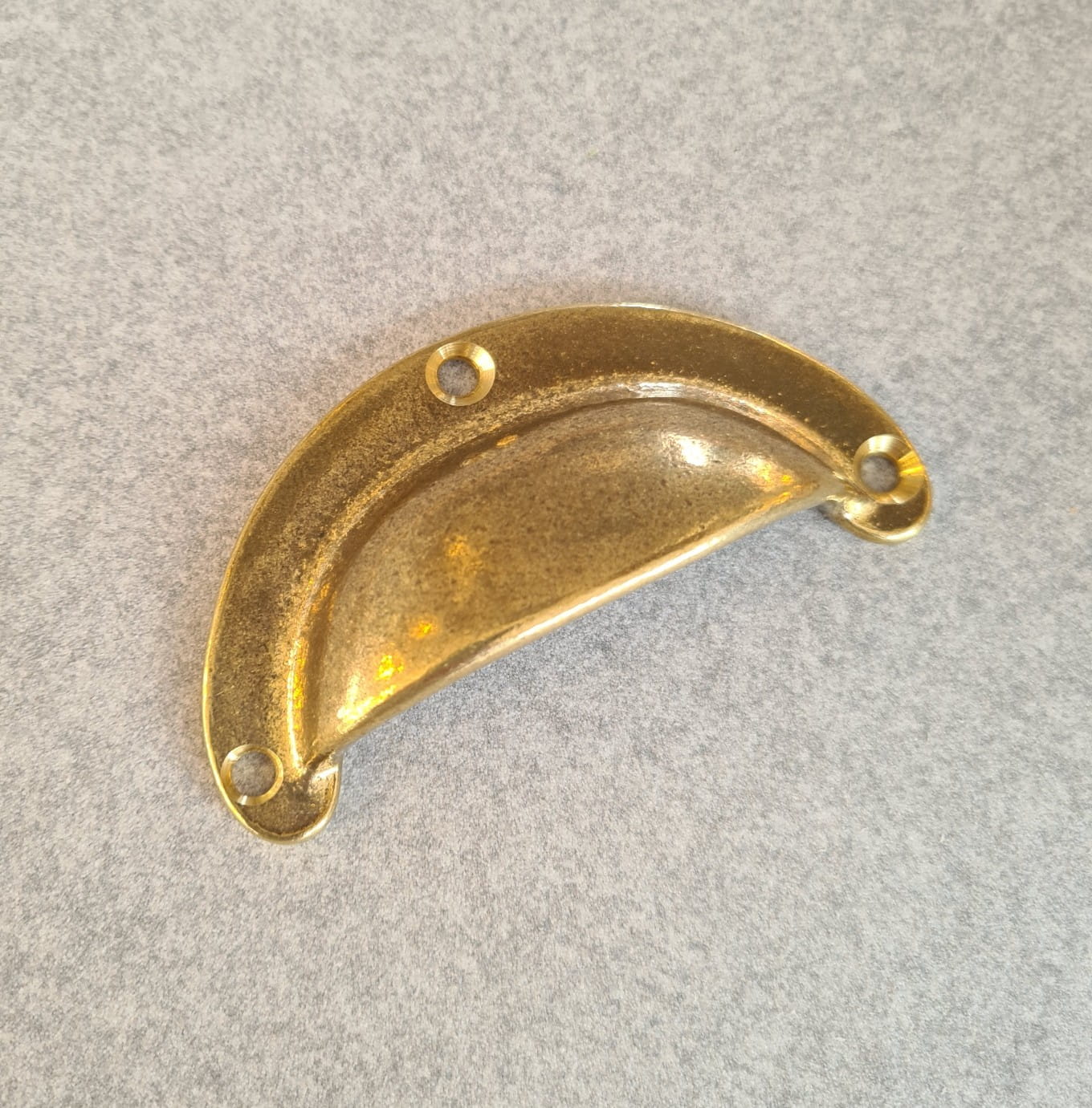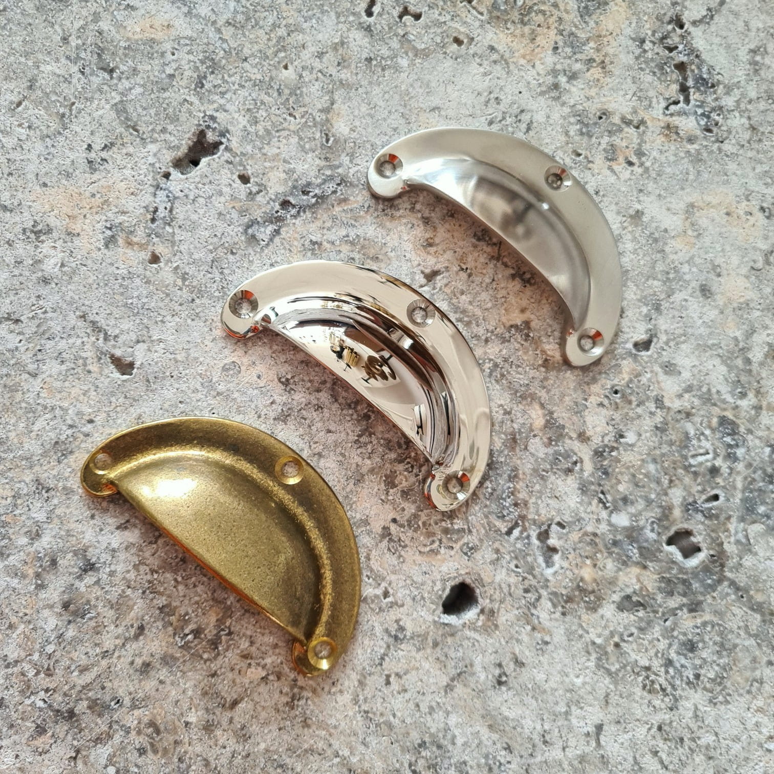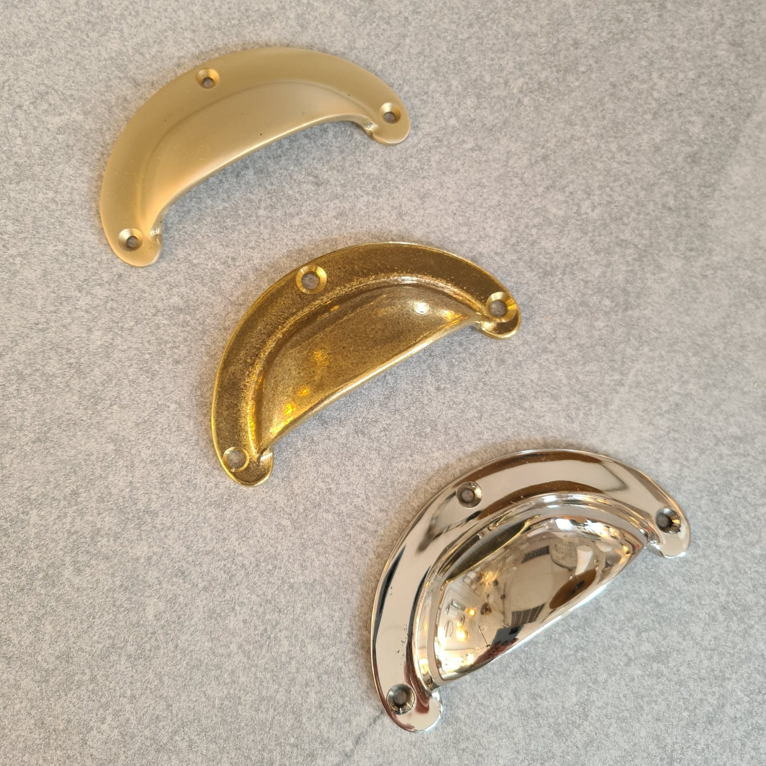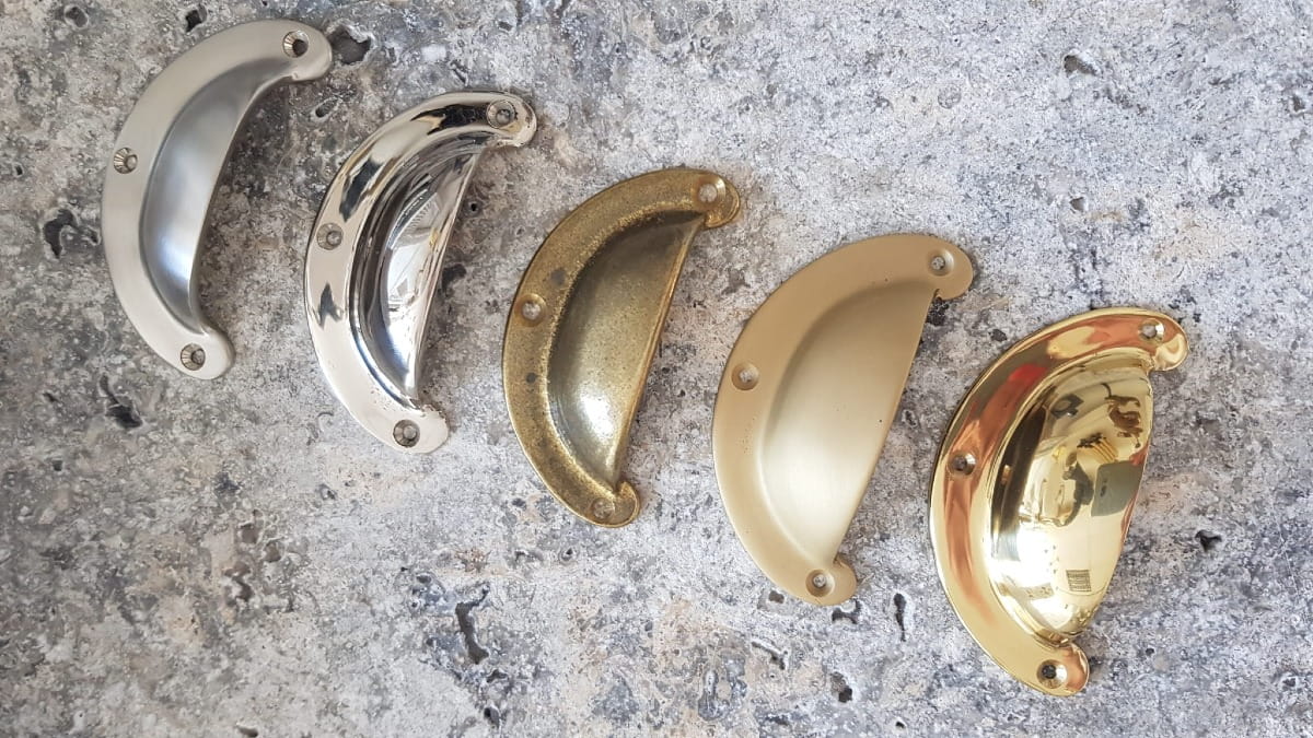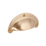 Klasyczny bardzo lubiany uchwyt meblowy w kształcie muszelki z widocznymi śrubami montażowymi.