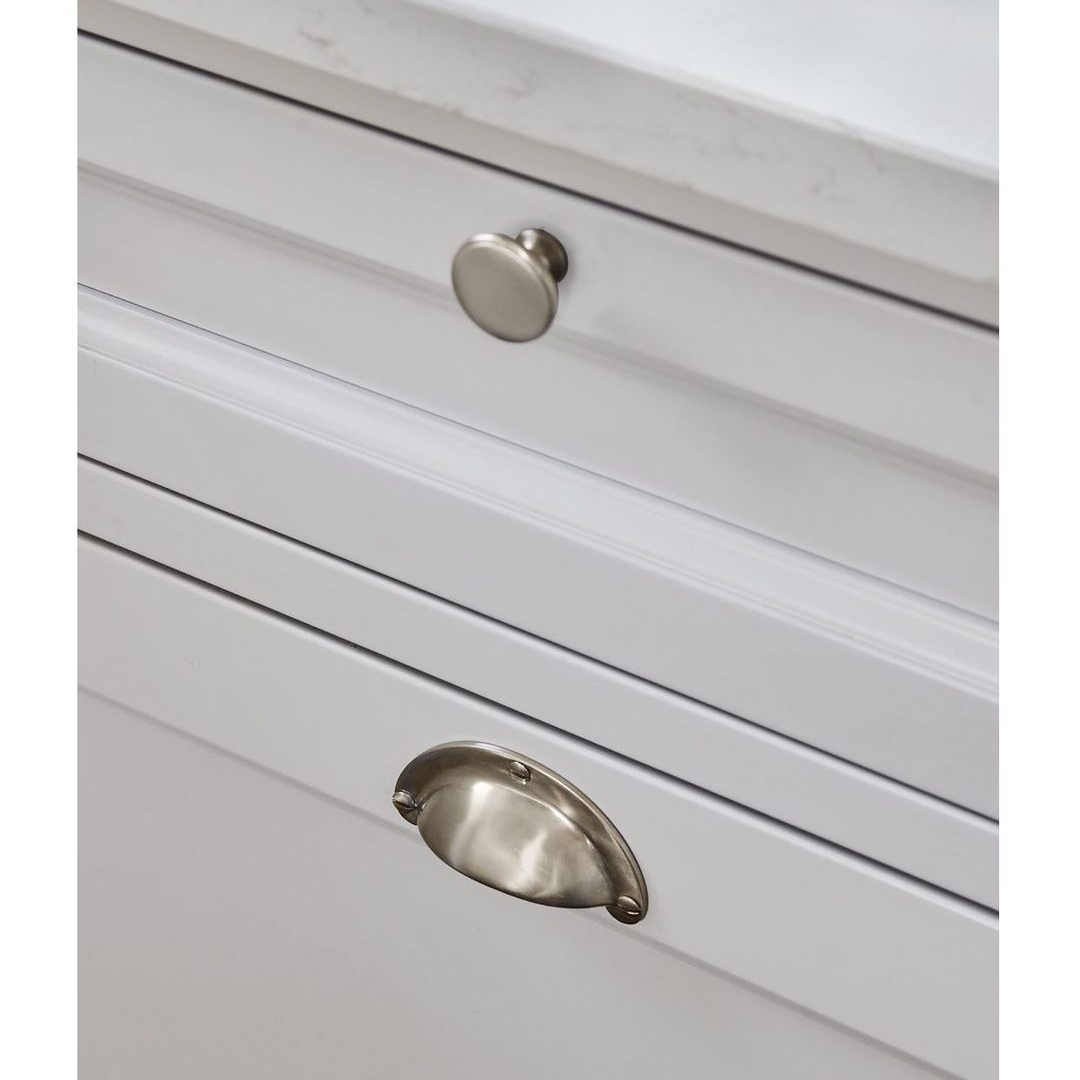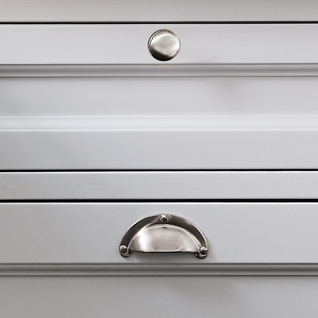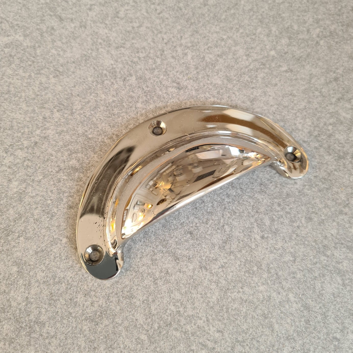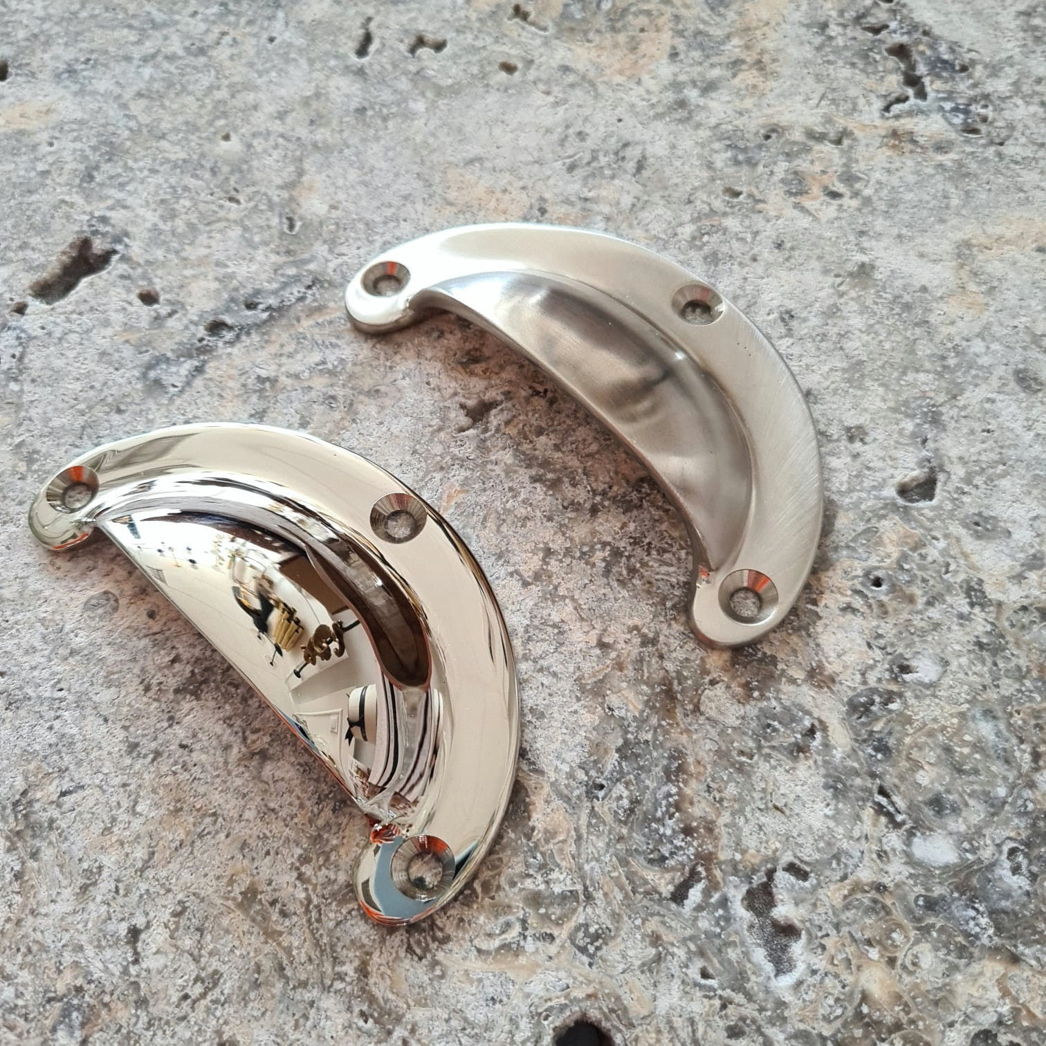 Klasyczny bardzo lubiany uchwyt meblowy w kształcie muszelki z widocznymi śrubami montażowymi.